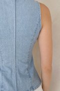 Made of soft denim. Fully-lined. Non-sheer. Not stretchable. Comes with one piece removable padding. Features round neckline and concealed back zip. If you are in between sizes, you may choose to stick to your usual sizing.