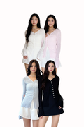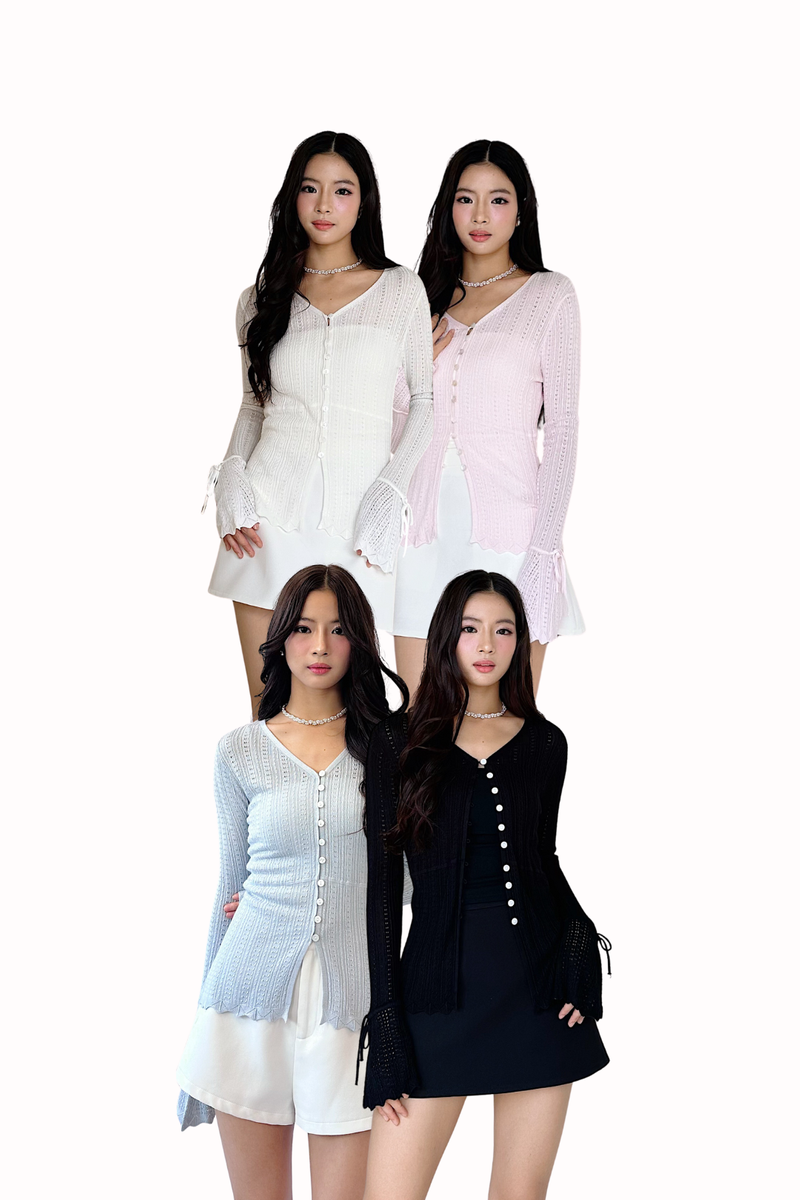 Made of knit. Non-sheer. Slightly stretchable. Features bell sleeve detailing, seashell buttons, scallop-edged hems and self tie detailing. If you are in between sizes, you may choose to stick to your usual sizing.