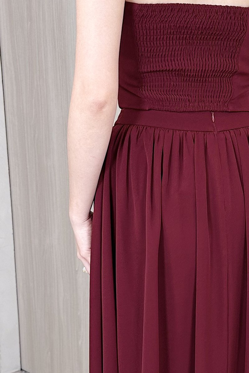 Made of polyester blend. Fully-lined. Non-sheer. Stretchable due to smocked back. Comes with removable one piece padding and an anti-slip band. Features pleats, self-tie straps, detachable adjustable straps, smocked back, and concealed side zip. If you are in between sizes, you may choose to stick to your usual sizing.