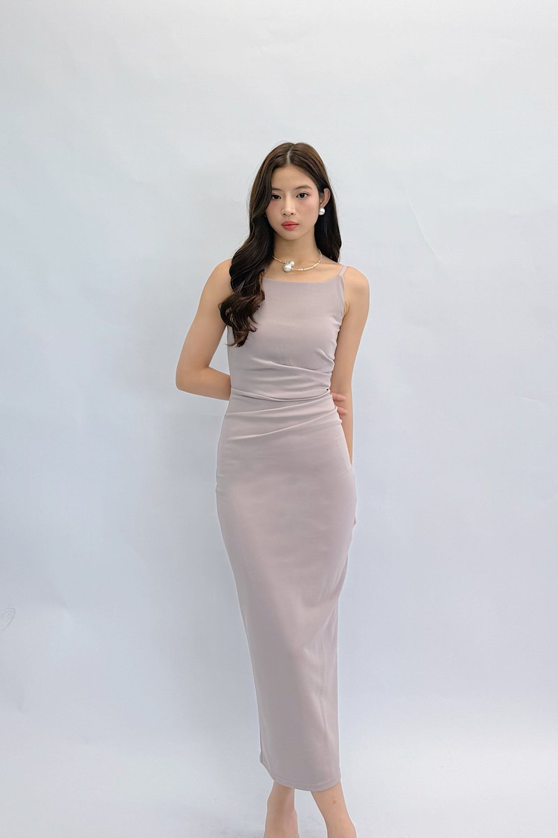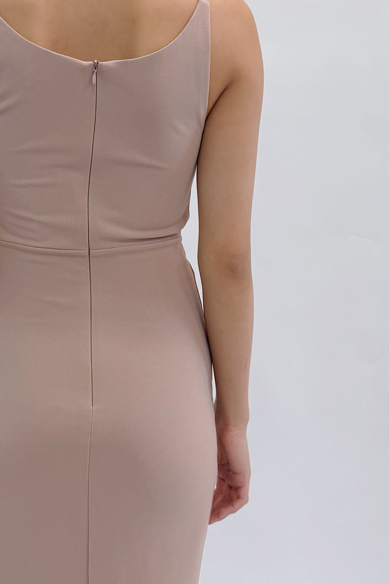 Esther, designed with a clean boat neckline and gentle ruching that contours your shape, this midi dress flatters the figure while offering a polished, feminine finish—ideal for special occasions or elevated everyday wear.