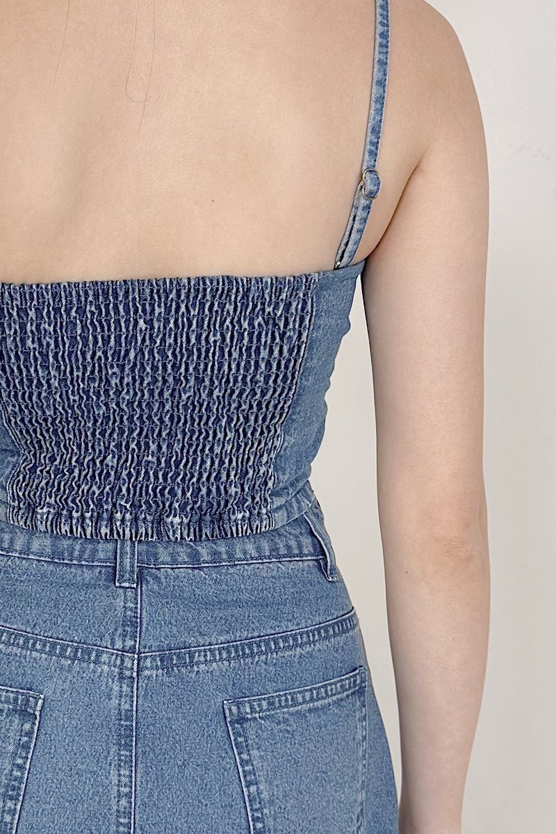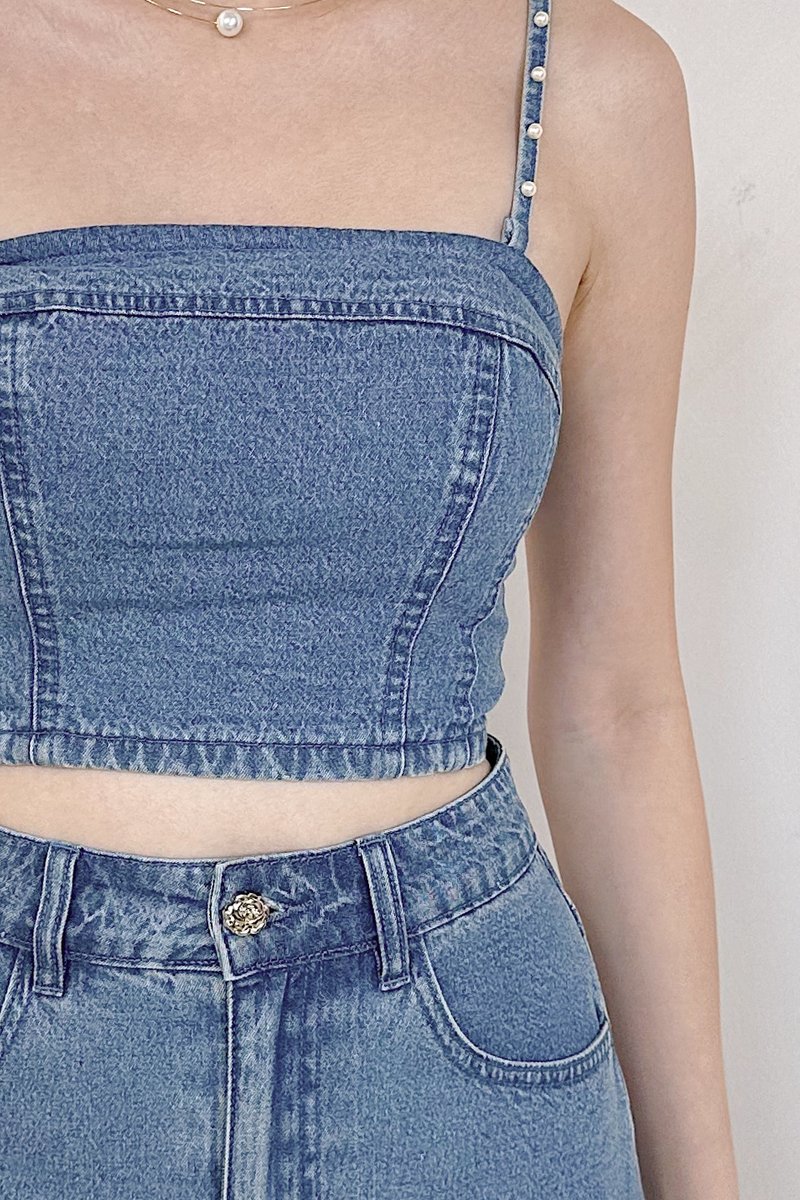 Haisley Top in Light Wash, Mid Wash & Dark Wash comes with detachable adjustable pearl straps