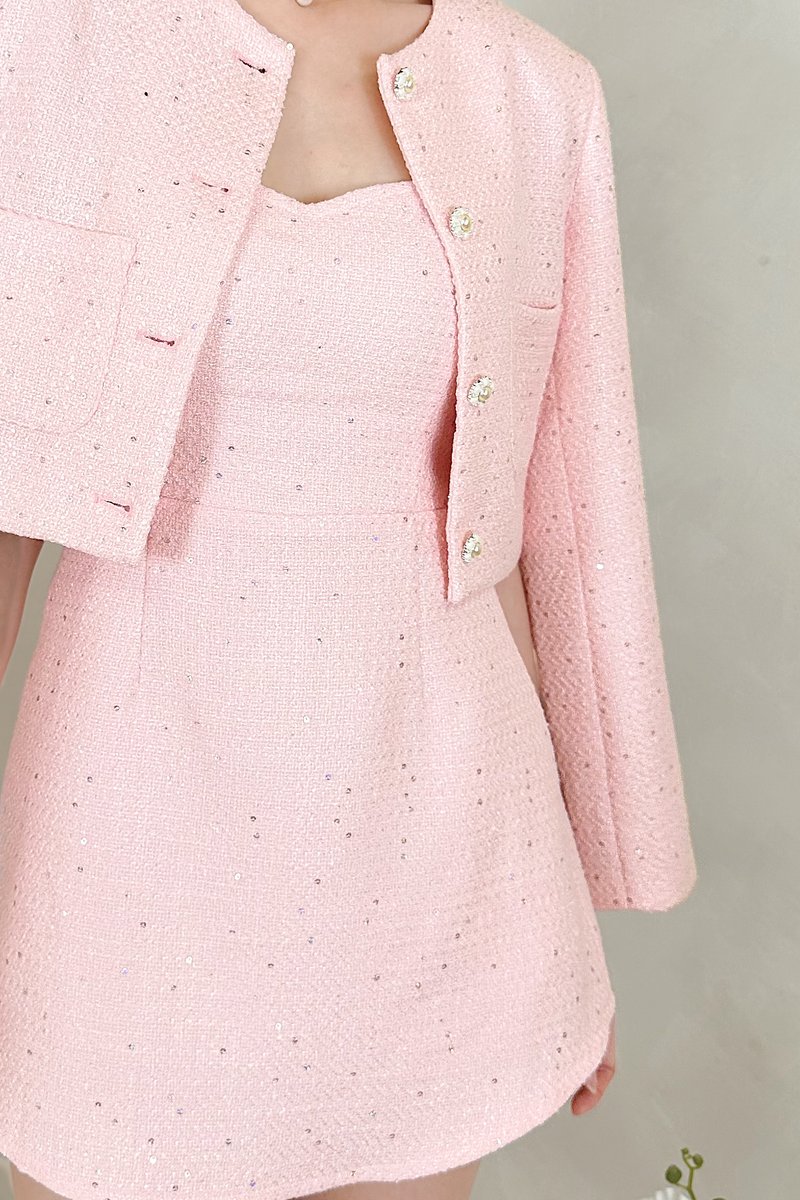 Made of suede tweed. Fully-lined. Non-sheer. Not stretchable. Features functional pearl camellia buttons, sequins, functional pockets and slight shoulder padding. If you are in between sizes, you may choose to stick to your usual sizing.