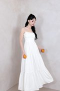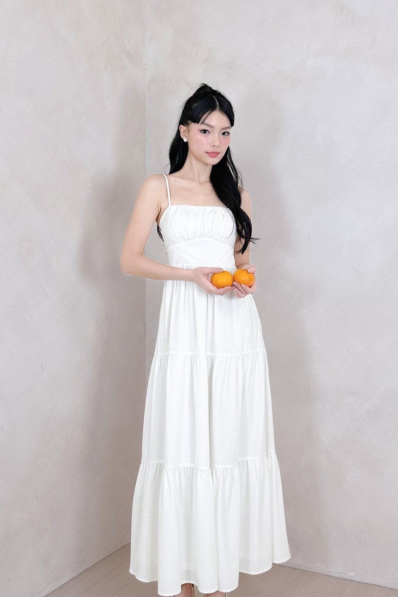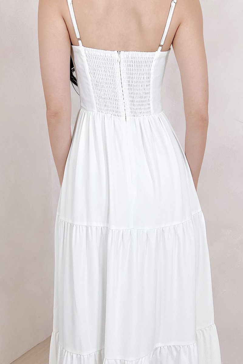 Lorelle Straight Neckline Ruched Tiered Midi Dress in White
