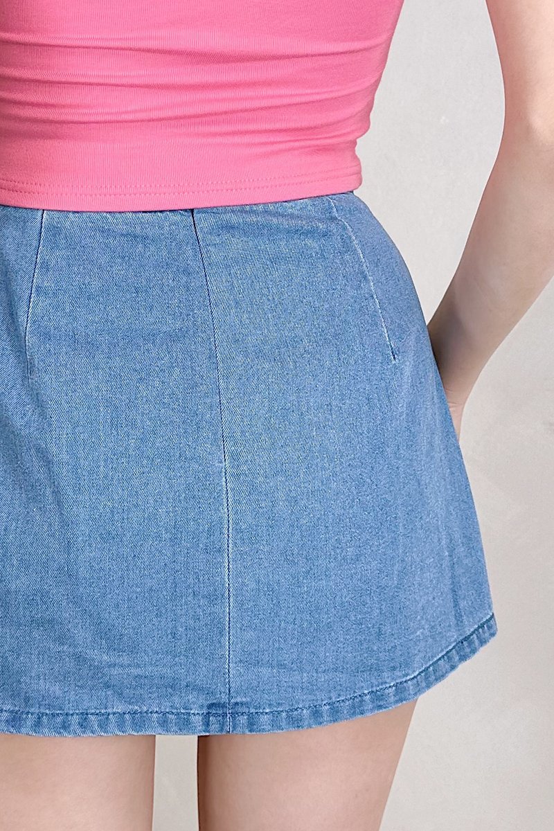 Say hello to your new everyday essential: the Arianna Skorts. Blending the look of a classic denim mini skirt with the comfort of hidden shorts, this piece is all about effortless style and ease of movement.