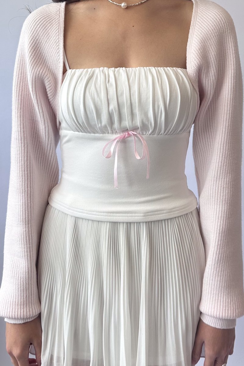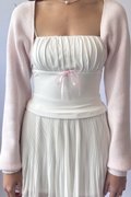 Made of knit. Fully-lined. Non-sheer. Stretchable. Features bolero and long sleeves. If you are in between sizes, you may choose to stick to your usual sizing.