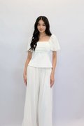 Made of polyester blend and mesh. Fully-lined. Non-sheer. Slight stretchable due to smocked back. Comes with removable one-piece padding. Features pleated sleeves, pleats detailing and concealed back zip. If you are in between sizes, you may choose to stick to your usual sizing.