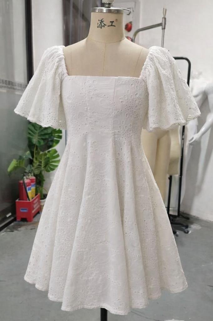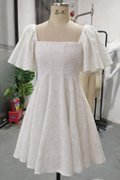 Made of eyelet cotton. Fully-lined. Non-sheer. Slightly stretchable due to smocked back and anti-slip band. Comes with one piece removable padding. Features straight neckline, flutter sleeve and concealed back zip. If you are in between sizes, you may choose to stick to your usual sizing.