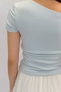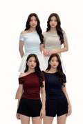 Made of cotton ribbed knit. Double-lined. Non-sheer. Stretchable. Comes with one piece removable padding. Features off shoulder and ruching. If you are in between sizes, you may choose to stick to your usual sizing.