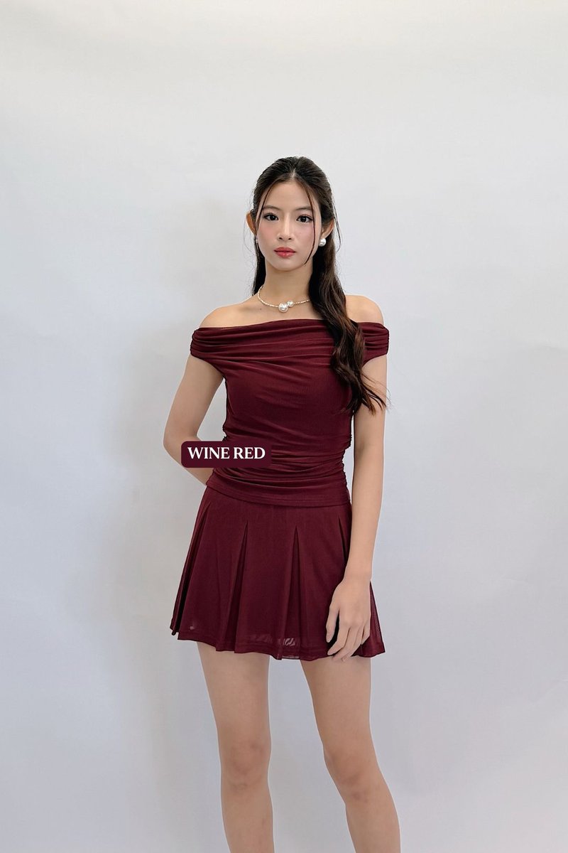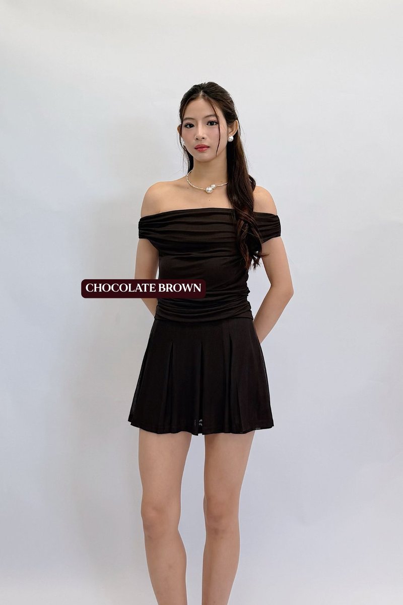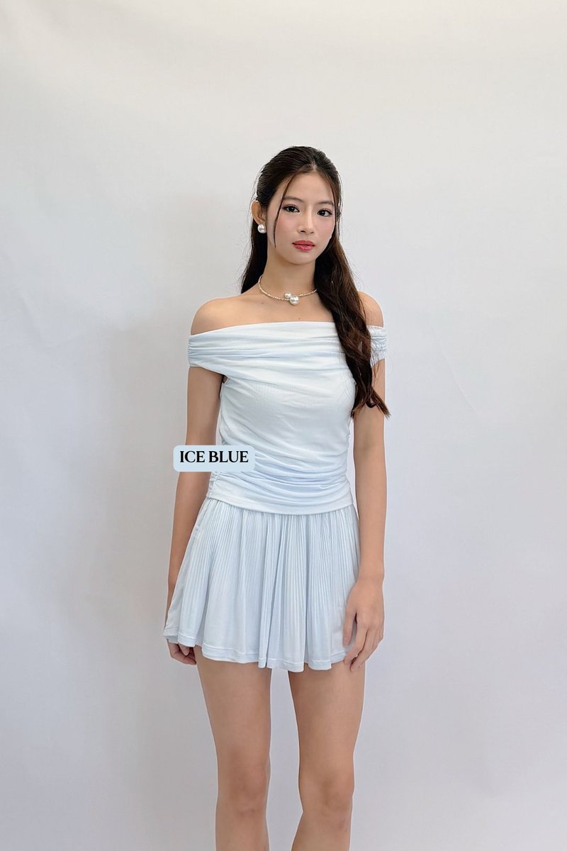 Made of ice mesh. Fully-lined. Non-sheer. Slightly stretchable. Comes with one piece removable padding. Features off-shoulder and ruching. If you are in between sizes, you may choose to stick to your usual sizing.