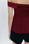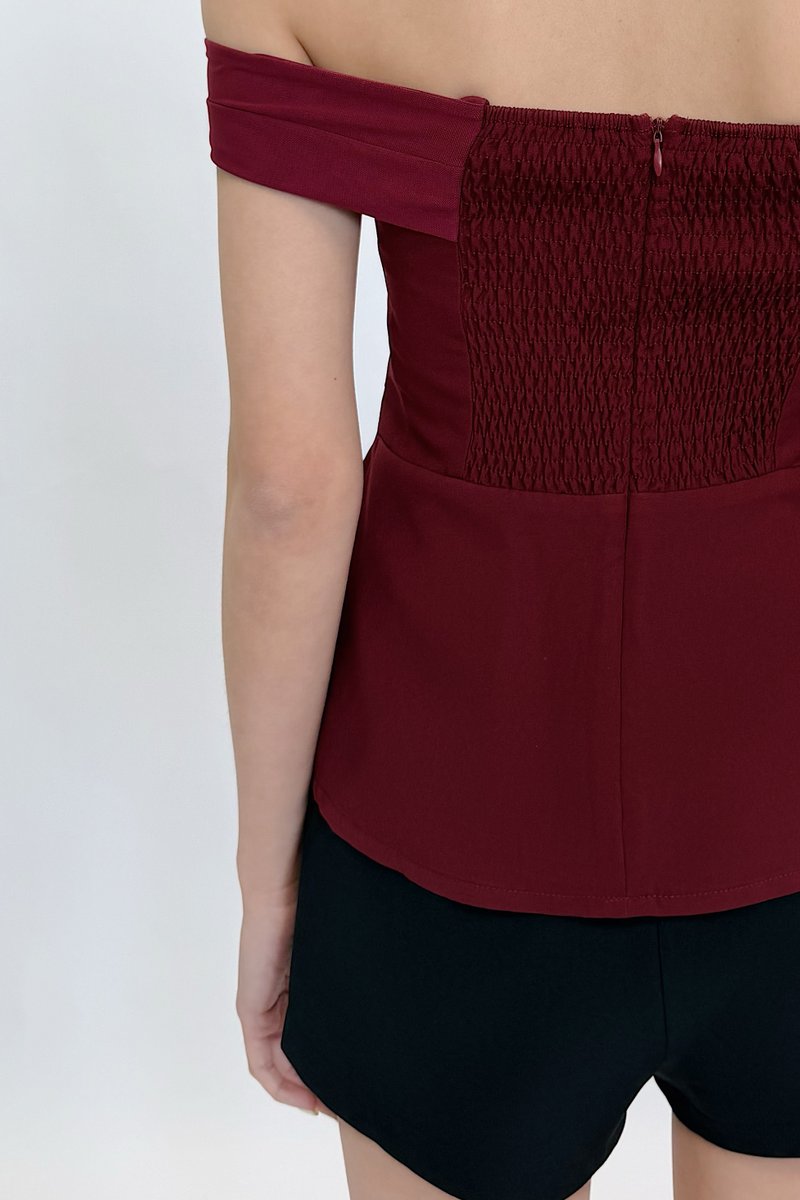 Made of polyester blend and mesh. Fully-lined. Non-sheer. Slightly stretchable due to smocked back and anti-slip band. Comes with one piece removable padding. Features panel details, mesh off shoulder and concealed back zip. If you are in between sizes, you may choose to stick to your usual sizing.