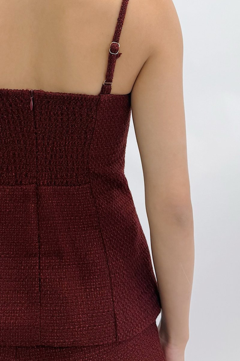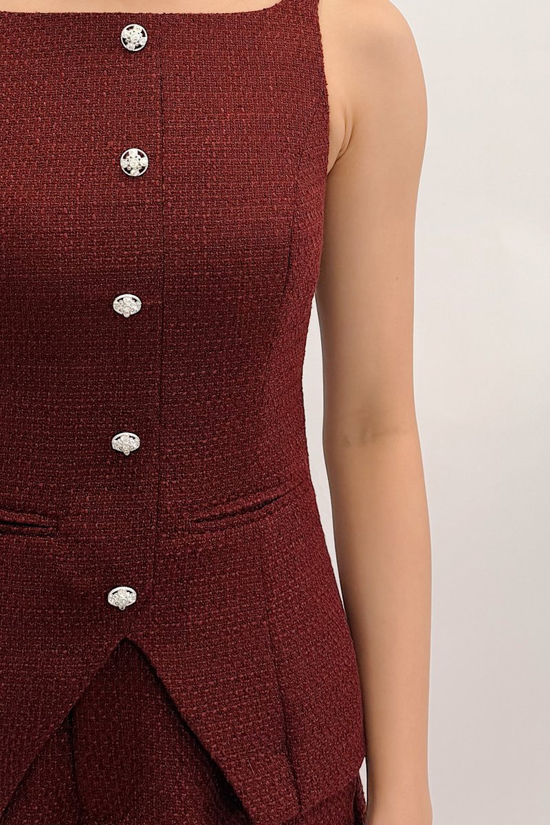 Made of tweed. Fully-lined. Non-sheer. Slightly stretchable due to smocked back. Comes with one piece removable padding. Features non-functional crystal buttons, non-functional front pockets, v hem, adjustable straps and concealed back zip. If you are in between sizes, you may choose to stick to your usual sizing.