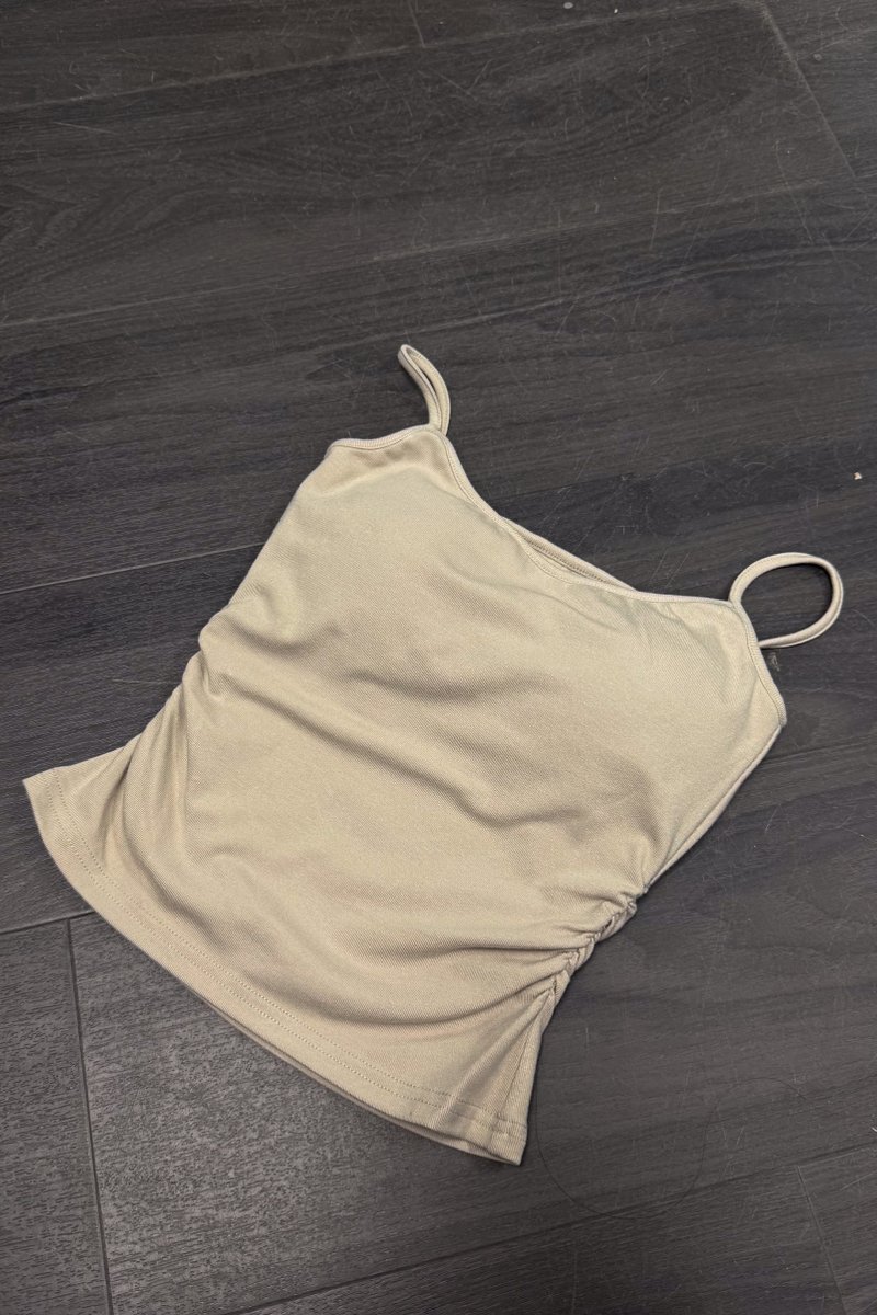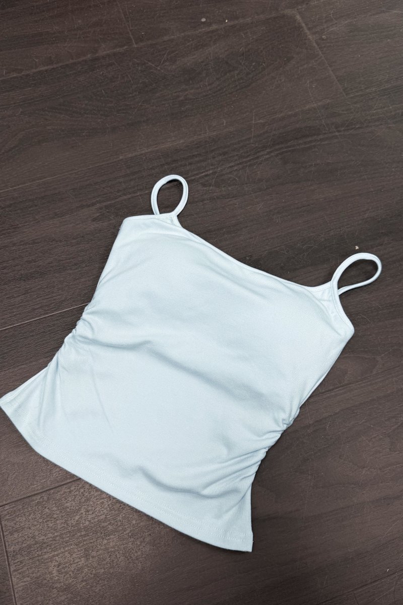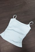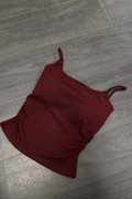 Top: Made of cotton ribbed knit. Fully-lined. Non-sheer. Stretchable. Comes with one-piece removable padding. Features non-adjustable straps and ruching. If you are in between sizes, you may choose to stick to your usual sizing.
