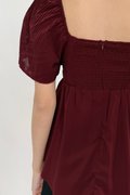 Made of ice chiffon. Fully-lined. Non-sheer. Slightly stretchable due to smocked back. Comes with one piece removable padding. Features ruching, babydoll fit, pleated sleeve and concealed back zip. If you are in between sizes, you may choose to stick to your usual sizing.