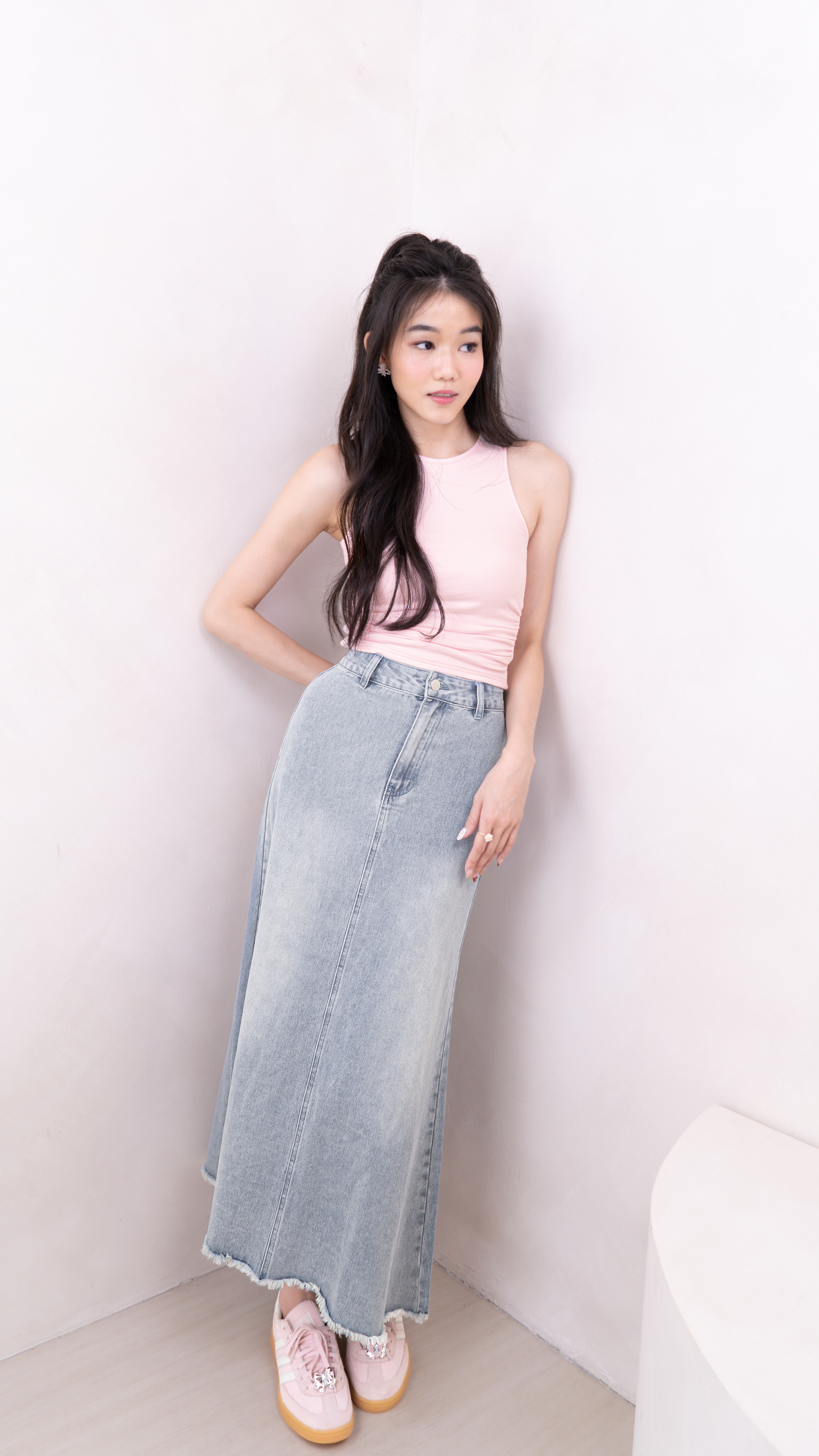 Mira Denim Maxi Skirt with Chain Belt in Light Wash