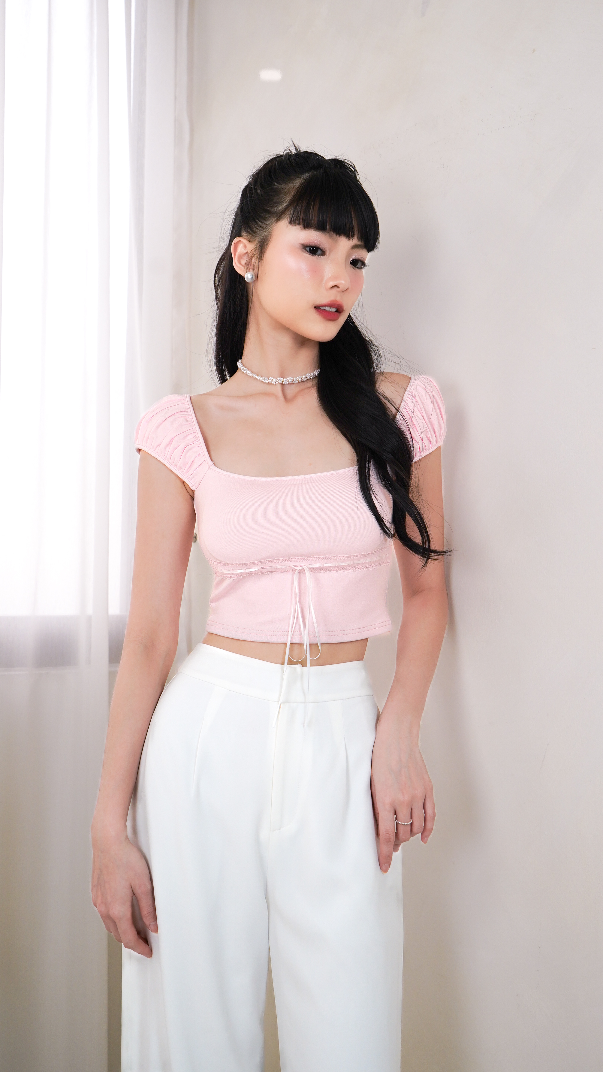 (BARE/BASIC) Elsa Lace Ribbon Top in Baby Pink with White Ribbon