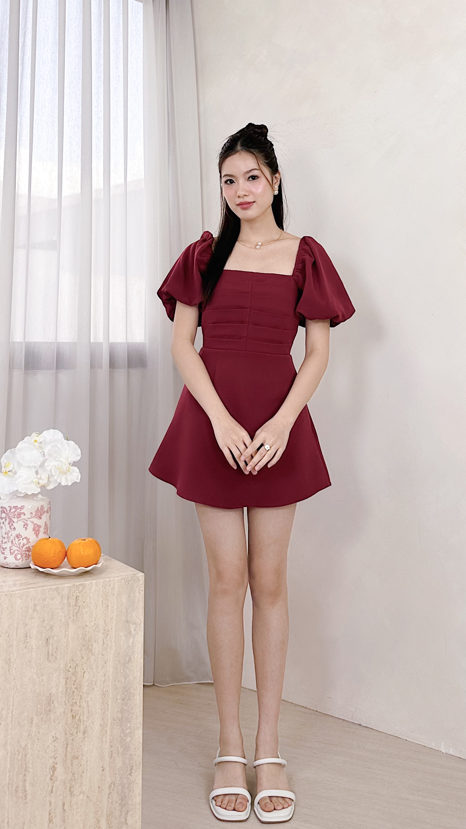 Irine Pleated Smocked Dress Romper in Maroon