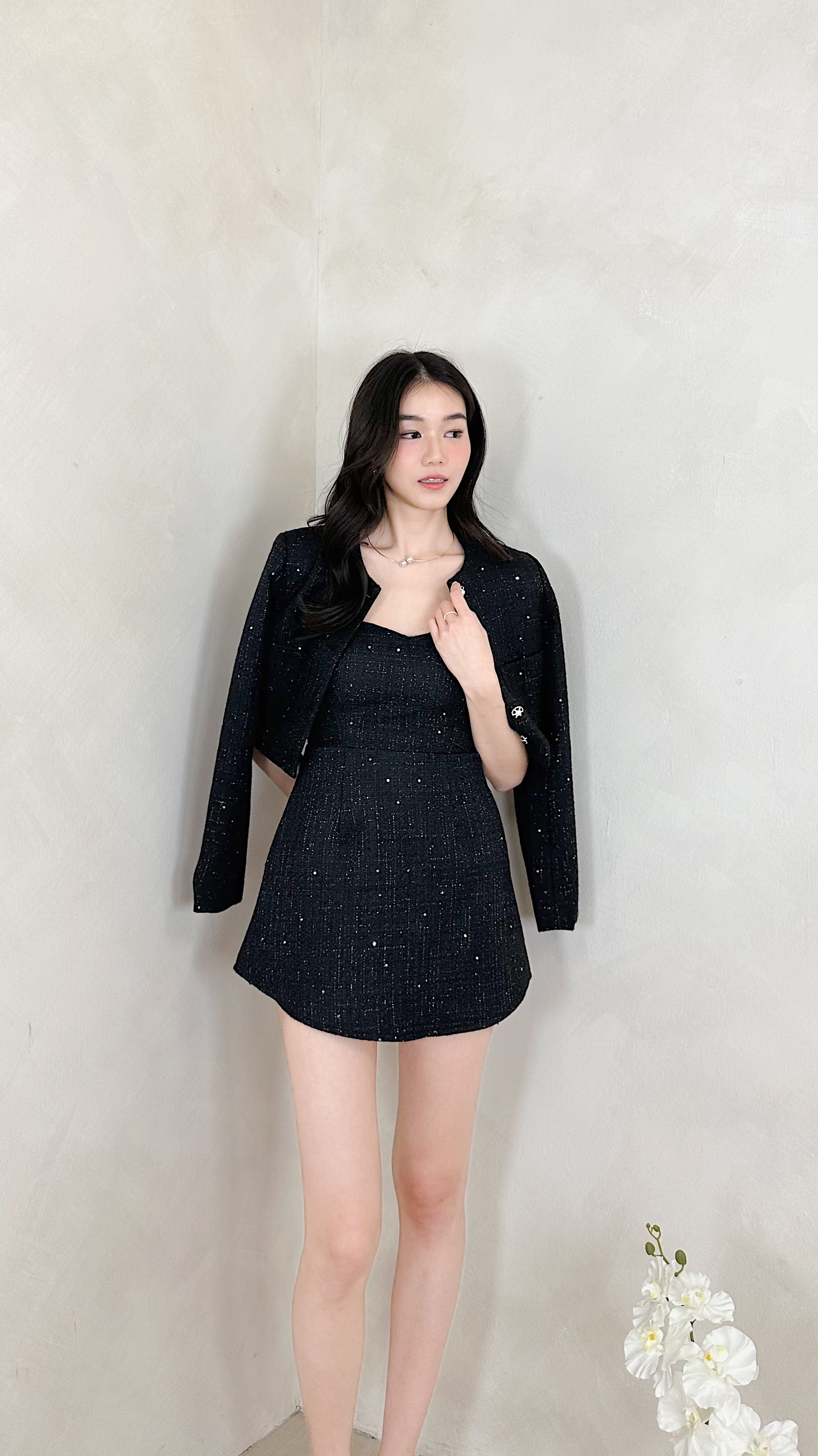 Ivie Sequin Tweed Blazer in Black with Silver Threads